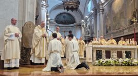 Il Vescovo ha ricordato i cardini della vita diaconale, che i candidati hanno promesso di abbracciare: la preghiera attraverso la Liturgia delle Ore: non una formalità o un compito da misurare in minuti, ma un “continuo risvegliarsi” per cercare Cristo nelle Scritture e restare in comunione con tutto il corpo di Cristo che è la Chiesa; l’Eucaristia come forma di vita: “Sarete voi a invitare quotidianamente il Signore a fermarsi a casa con voi. Coltiverete il desiderio di una relazione autentica e calorosa con Lui. Gli chiederete di fermarsi con voi ad ogni sera reale o figurata della vita, ad ogni tramonto – del sole, del coraggio, dell’entusiasmo, della forza (…). Eucaristia sarà il nome di ogni consolazione, di ogni speranza rinnovata, di ogni impegno ad affrontare la fatica”; il celibato, scelto per il Regno dei Cieli, un impegno da custodire “nella fedeltà e nella perseveranza, come dono prezioso che il Signore vi concede di accogliere”. “Che in esso, sia quando sarà gioiosa esperienza di amore donato e corrisposto, sia quando sarà arido passaggio in paesaggi desertici e impegnativi, possiate riconoscere – l’augurio del Vescovo – nel profondo del cuore, nella verità degli affetti, nell’interezza della vostra umana esperienza la stessa stupita scoperta dei due di Emmaus: “Non ardeva forse in noi il nostro cuore mentre egli conversava con noi lungo la via, quando ci spiegava le Scritture?” Conversazione di amore, fonte di vera vita”.